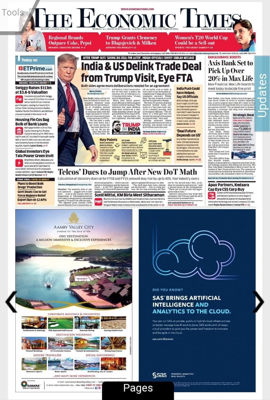 The Economic Times is into delinking the trade deal from Trump’s visit, citing statements from both countries — “more deliberations were needed”, it declares.