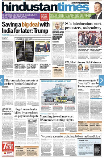 Instead, the paper leads with Shaheen Bagh, noting, “The interlocutors sent by the Supreme Court were welcomed at Shaheen Bagh on Wednesday with a standing ovation.” The bad news? Protesters “suggested little room for negotiations”.