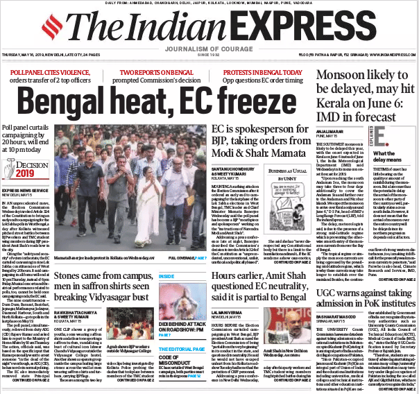 Bengal emblazons front pages for a second day in a row, Thursday — this time the Election Commission is under the headlines’ scanner. Times of India in “In a first, EC cuts short Bengal campaign for Phase 7 by a day” writes “Amid surging threats of violence during the last phase of polls in West Bengal”.