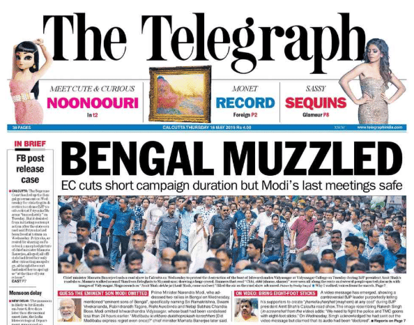 The Telegraph, however, writes “the unparalleled pruning of the campaign window came hours after the Union Home ministry took the rare step of writing to the poll panel expressing concern at the electoral violence in Bengal”.
