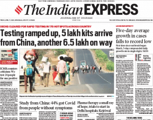 The lead story in The Indian Express is ‘Testing ramped up, 5 lakh kits arrive from China, another 6.5 lakh on way’. The paper reports, “With four days to go for conditional easing of restrictions in specific areas, testing has been stepped up… the number of samples tested in the last 24 hours crossed 30,000 for the first time on Thursday…”