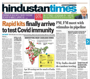 Following the Express, Hindustan Times’ lead story is, “Rapid kits finally arrive to test Covid immunity”. The paper reports that the Rapid Testing Kits, which use antibody-based blood tests “will likely be used to test for coronavirus disease in areas with no or few cases — the health ministry’s green zones — according to an official at the Indian Council of Medical Research (ICMR).”