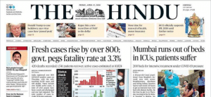 While other newspapers go with relatively positive stories, The Hindu’s lead is ‘Fresh cases rise by over 800; govt. pegs fatality rate at 3.3%’.