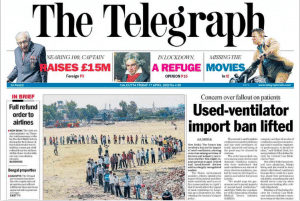 The Kolkata daily always likes to go its own way. So its lead today is, ‘Used-ventilator import ban lifted’. The paper says, “The Centre has revoked a ban on the import of used ventilators, stirring concerns among sections of doctors and industry executives whether this might expose patients to aged, retired and uncalibrated devices.’’ Telegraph says that the environment ministry, “…in an office memorandum on April 1 (said) that it would allow the import of used ventilators by hospitals up to September 30, 2020….”