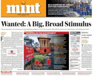 Mint’s lead story ‘Wanted: A Big, Broad Stimulus’ anticipates a massive economic package to be announced by FM Sitharaman. One of the measures expected is subsidised wages, “based on a German model that gave people short-time work… helping Europe’s largest economy emerge from the 2009 recession faster than others”, it reports.