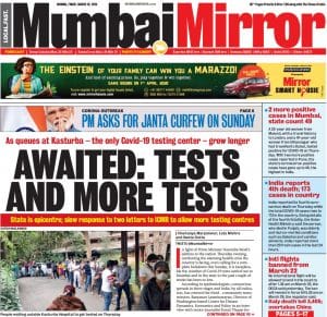 Mumbai Mirror worries that not enough is being done to detect coronavirus cases. Its lead says, ‘As queues at Kasturba – the only Covid-19 testing center – grow longer. AWAITED: TESTS AND MORE TESTS’. It notes that Maharashtra is the epicentre and also the “slow response to two letters to ICMR to allow more testing centres”.