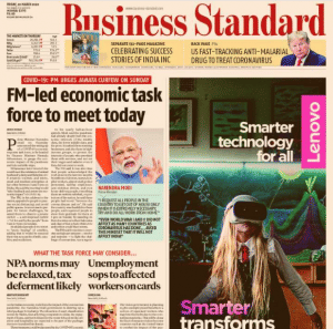 Meanwhile, “With the COVID-19 wreaking havoc in Indian financial markets”, an economic response task force has also been constituted under Finance Minister Nirmala Sitharaman. According to the page 1 report ‘Economy infected: Task force has a prescription…’, its agenda will include”an immediate cut in policy rate, regulatory forbearance for sectors in the frontline of disruptions, government guarantee for loans to SMEs, deferment of taxes, and livelihood support for unorganised workers”.