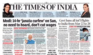 The lead story (‘Modi: 14-hr ‘janata curfew on Sun…’) is on the ‘janata curfew’ this Sunday. The curfew is to be observed by “staying indoors on Sunday between 7am and 9pm as an expression of resolve to emphasise the need to reduce public interaction to the very minimum,” writes TOI, reflecting the PM’s speech.