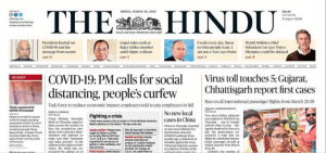 Unsurprisingly, The Hindu also leads with ‘COVID-19: PM calls for social distancing, people’s curfew’ but the other prominent story, ‘Virus toll touches 5; Gujarat, Chhattisgarh report first cases’ highlights that the total number of active coronavirus cases is 148 so far. While the official death toll in the country is 4, Hindu makes notes of the death of an Indian national in Iran.