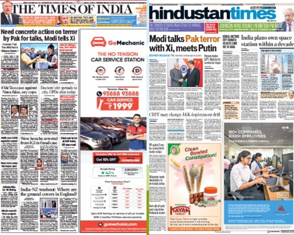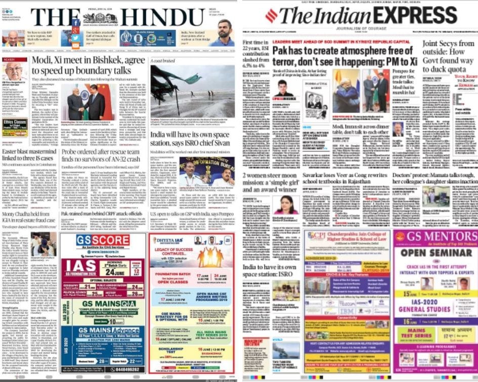 All lead reports Friday follow Prime Minister Narendra Modi Bishkek at the Shanghai Cooperation Organisation summit. The Times of India, The Indian Express and Hindustan Times put India’s woes with Pakistan in their eye-catching headlines but concentrate on the PM’s discussions with Chinese President Xi Jinping in their copy.