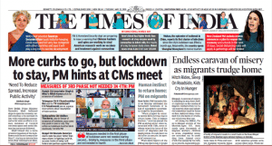 The Times Of India’s lead concentrates on the Prime Minister’s comments to CMs. In ‘More curbs to go, but lockdown to stay, PM hints at CMs meet’, the paper reports, “Modi hinted that a more graded relaxation of the lockdown could be on its way after May 17…’’