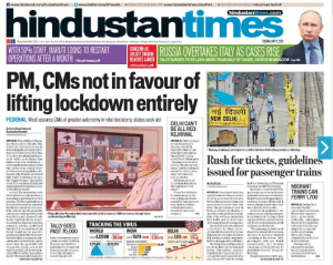 On Modi’s meeting with the CMs, Hindustan Times focuses on the PM’s comments. In ‘PM, CMs not in favour of lifting lockdown entirely’ it dwells on what the PM saying that “India now had a good sense of the spread of the disease…’’ He urged states to prepare a road map for the next phase of the lockdown and said … “full resumption of rail travel would not be possible”.