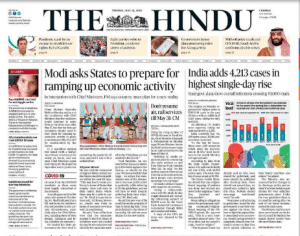 Living up to its record keeper image, The Hindu notes, ‘India adds 4,213 cases in highest single-day rise’, as it reports, “The country on Monday registered its highest spike in COVID-19 cases in the past 24 hours with an addition of 4,213 cases, taking the tally to 67,152. An additional 97 deaths were reported, taking the nationwide toll to 2,206.”