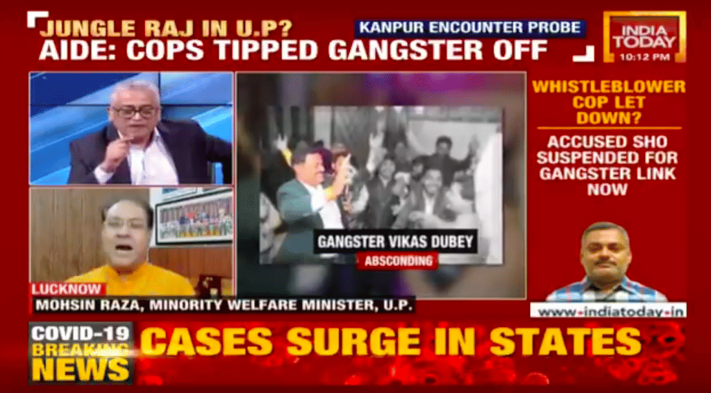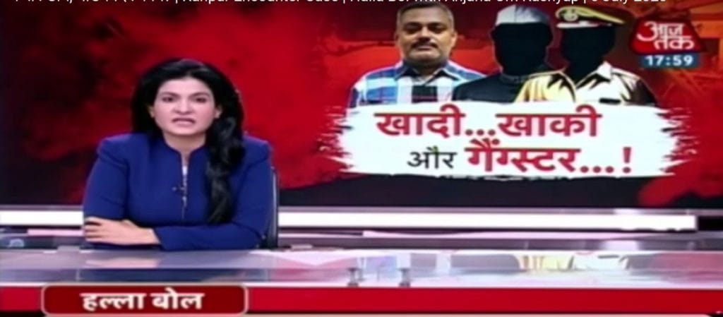 Anchor Romana Isar Khan on ABP News asked, “Who is saving Vikas Dubey?” The channel played videos of Dubey where he talked about his links with BJP MLAs Bhagwati Prasad Sagar and Abhijeet Sanga.