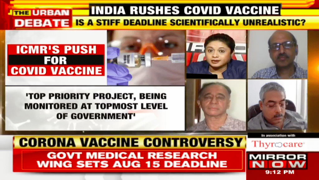 Anchor Tanvi Shukla on ‘The Urban Debate’ asked — “Is a stiff deadline scientifically unrealistic? Is setting a deadline in the development stage dangerous? What are the pitfalls in rushing through a vaccine?”