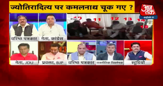 Aaj Tak’s anchor Rohit Sardana seemed in love with rhymes. Sardana asked, “Congress bachegi ya jaayegi” (Will the Congress survive or leave). To which, Rajesh Badal, journalist, said, “People will stay united with Scindia. At the same time, BJP is also faced with some challenges.”