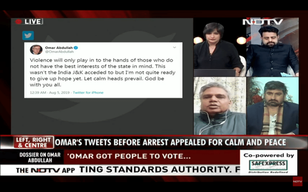 On NDTV 24×7, ‘Left Right and Centre’ anchor Ankita Mukherjee discussed a government dossier that lists out charges against former J&K chief minister Omar Abdullah, who has been detained under the Public Safety Act, which includes inexplicable things like his “ability to garner votes even during peak militancy and poll boycotts”, his “twitter clout” and his ability to influence “gullible masses”.