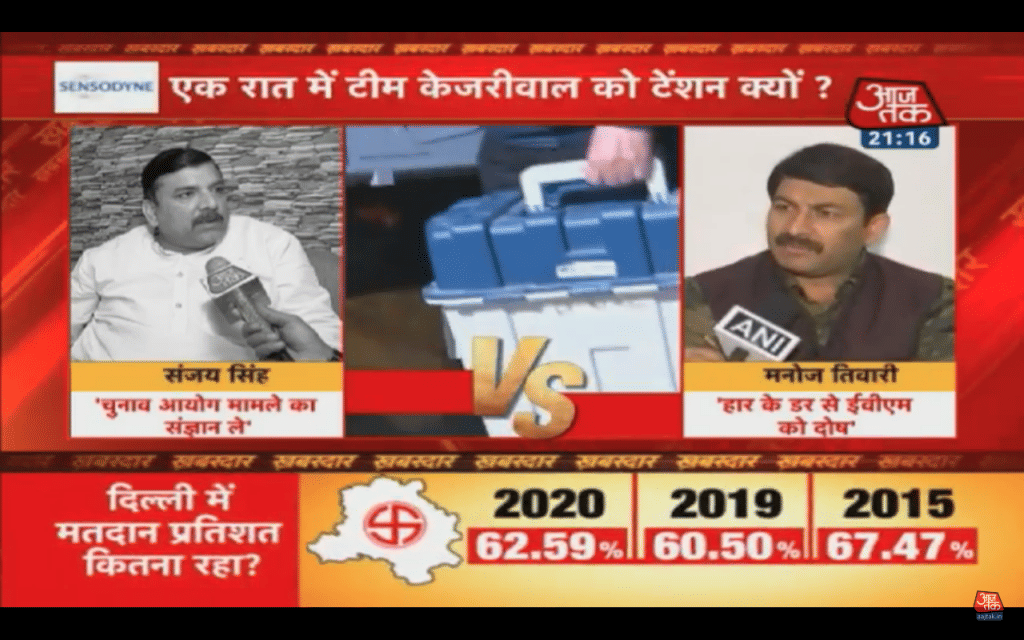 Aaj Tak looked at the post-poll EVM drama too. With a split screen, the channel first captured AAP leader Sanjay Singh’s view, who asked if there was a video of people running away with an EVM machine , then why wouldn’t questions be asked. On the other side of the screen, BJP Manoj Tiwari said “Arre baba kyun pareshan ho” (Why are you worried?), and added that such allegations were an excuse. He, further, said that the BJP had its own exit polls that said it would get 48 seats, if not more.