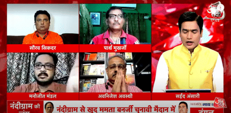 On Aaj Tak, anchor Sayeed Ansari discussed the West Bengal election in light of the death of a BJP worker’s mother, which led to a political slugfest between ruling Trinamool Congress (TMC) and the Bharatiya Janata Party (BJP). The BJP has alleged the woman had been attacked by workers of TMC, an allegation the latter denies.
