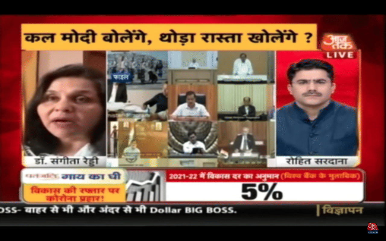 On Aaj Tak’s ‘Dangal’, host Rohit Sardana discussed how states like Tamil Nadu, Orissa, Maharashtra and Punjab had already announced extensions in their states. He asked business association FICCI President Sangeeta Reddy what suggestions her team had given to Prime Minister Modi on the lockdown. Reddy said that the government had been advised to take into account the crisis in the agricultural sector, as well as manufacturing and construction sectors. They advised the government to remove the lockdown, especially in green zones, in a phased manner and to put up frameworks to ensure social distancing and sanitation.