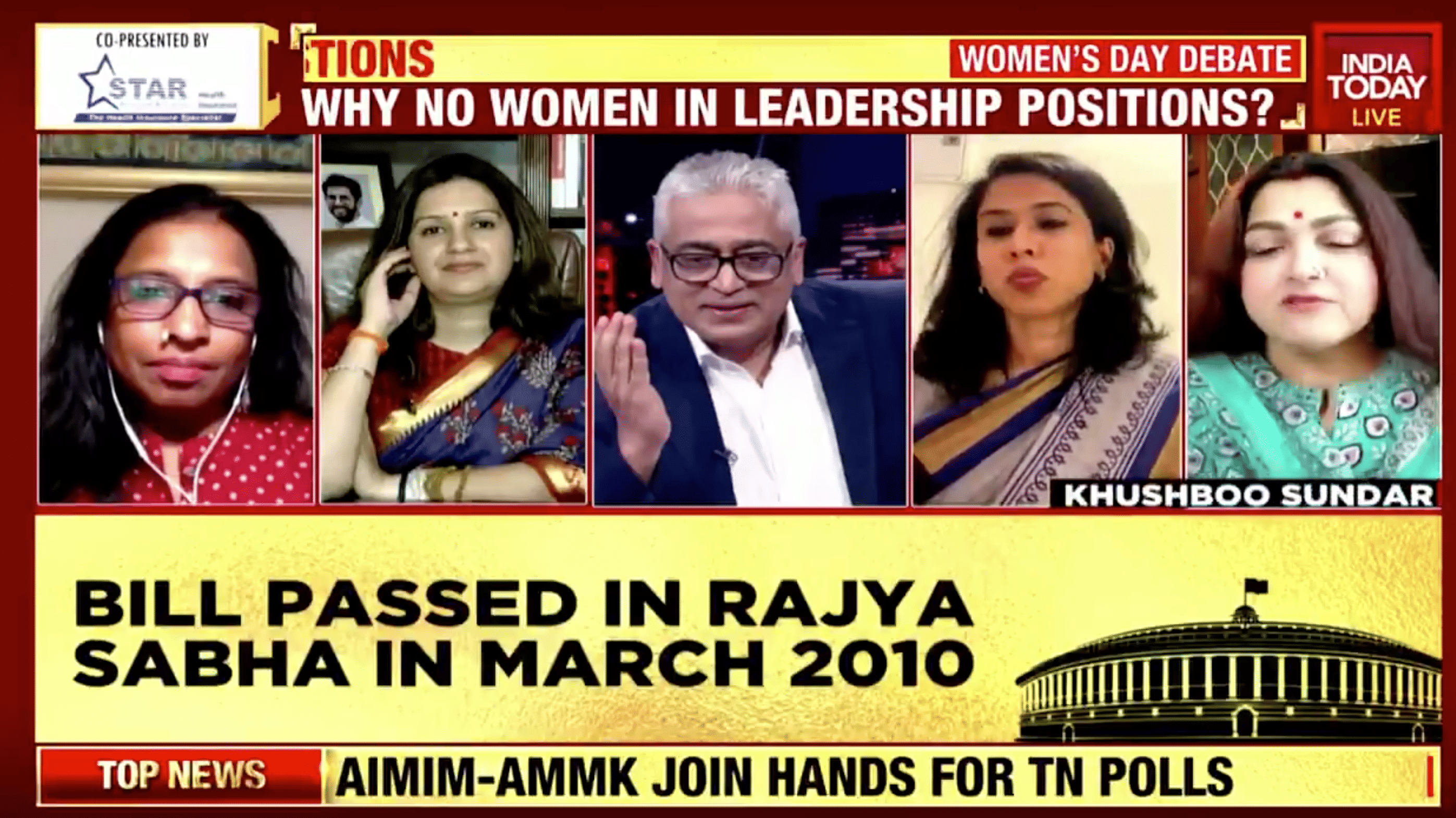 BJP’s Khushbu Sundar said, “Why can’t men get up and say that women rightly deserve it? We shouldn’t have to fight for reservation. We are looking at more than just 33 per cent reservation.”