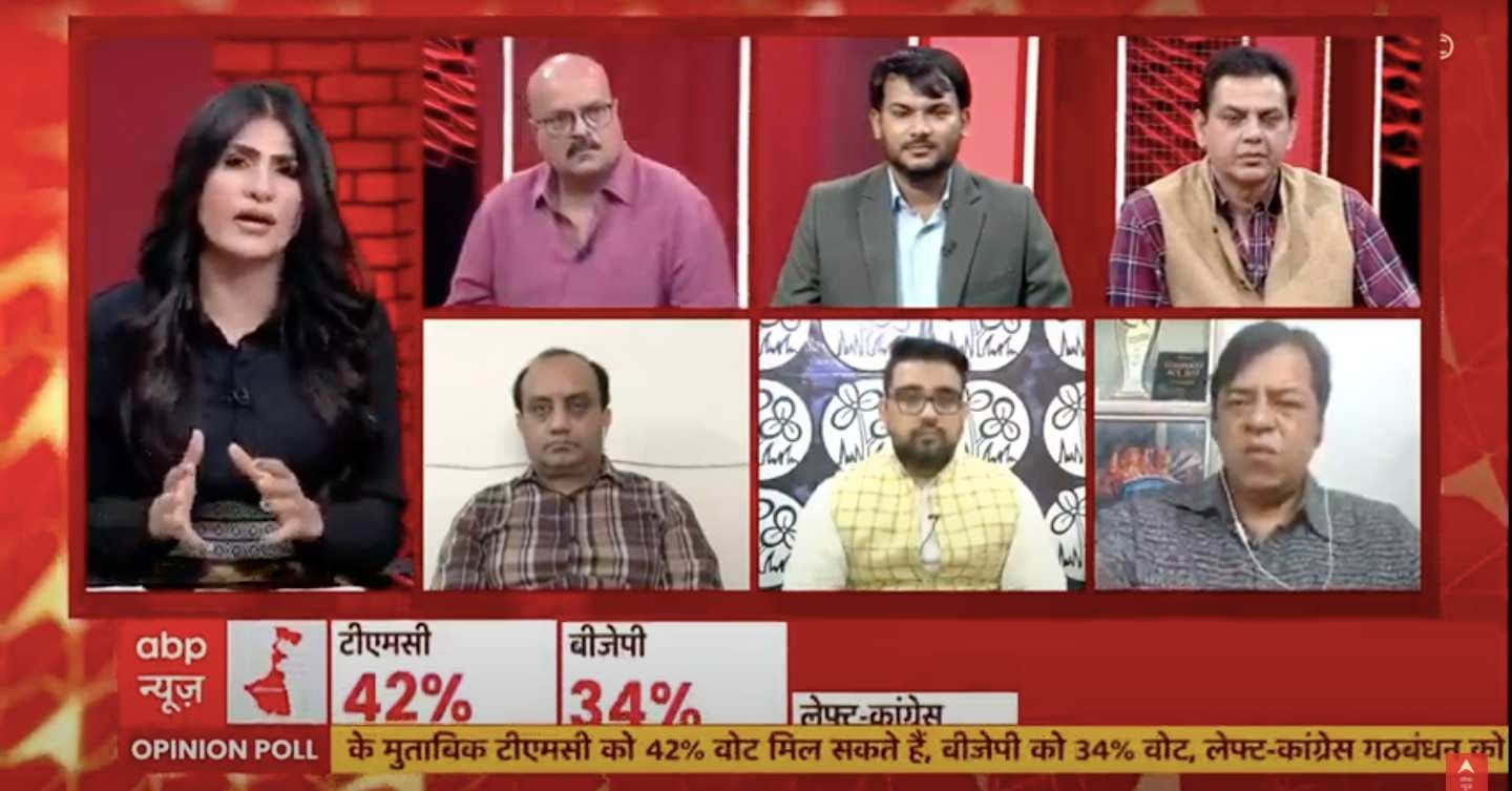 At ABP, anchor Rubika Liyaquat discussed the ABP-CNX survey on West Bengal elections. “This opinion poll was conducted before the big events — BJP, Congress rallies and before Mithun Chakraborty joined the BJP,” the anchor said. It shows a keen fight between TMC and BJP but Mamata Banerjee the favorite to be chief minister.”