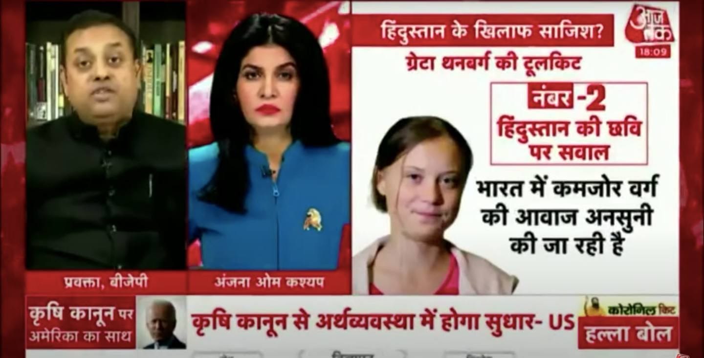 New Delhi: Swedish climate change activist Greta Thunberg’s tweet in support of the farmers’ protest had an even greater impact on prime time television than on the government. Her tweet on the “toolkit” and the subsequent FIR by Delhi Police dominated almost all TV debates. ABP News’ headline said it all — ‘Greta’s ‘Great Hate’ Story towards India’.