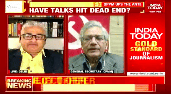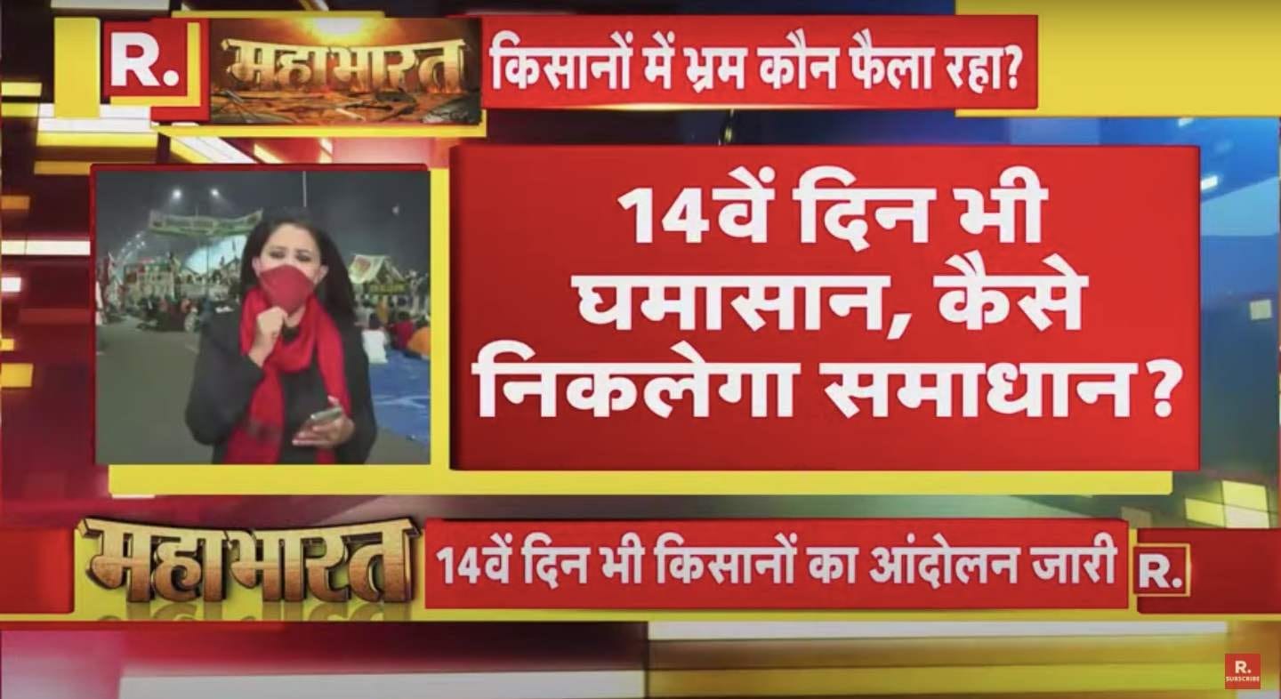 India Today’s Rajdeep Sardesai discussed the farmers’ protests with CPI(M) leader Sitaram Yechury while on Republic Bharat, anchor Sucherita Kukreti accused the Opposition of manipulating farmers. Mirror Now anchor Tanvi Shukla was more concerned about the “mysterious disease” in Andhra Pradesh.