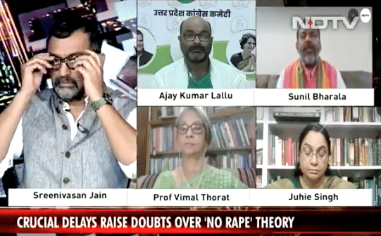 First, to Hathras. On NDTV 24×7, anchor Sreenivasan Jain explained how the “conduct of the Yogi Adityanath government and the UP Police in particular seems to be slipping in a worsening cycle.” Jain recounted how the police burnt the Dalit woman’s body in the middle of the night without her family’s consent or presence. He then reminded viewers about how the media was prevented from going to Hathras, how her family was barricaded in and threatened, and finally, how Opposition leaders were lathi-charged.