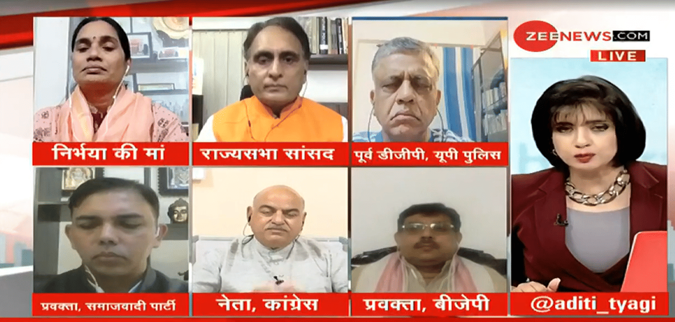Zee News discussed the Yogi Adityanath government’s allegation of the Hathras case being a ploy to taint the administration, with anchor Aditi Tyagi taking his side: “Will we now use our daughters to instigate riots?”