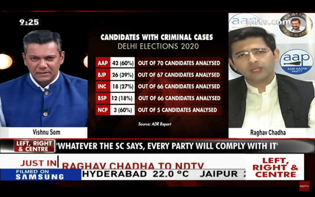 Som asked about Thursday’s Supreme Court ruling that political parties must reveal the reasons for selecting candidates with criminal records – 42 per cent of AAP candidates have criminal cases against them. Chadha responded by saying it was the “quality” of the cases that mattered, as more than two dozen related to protests or dharnas, not “murder-dacoity” cases.