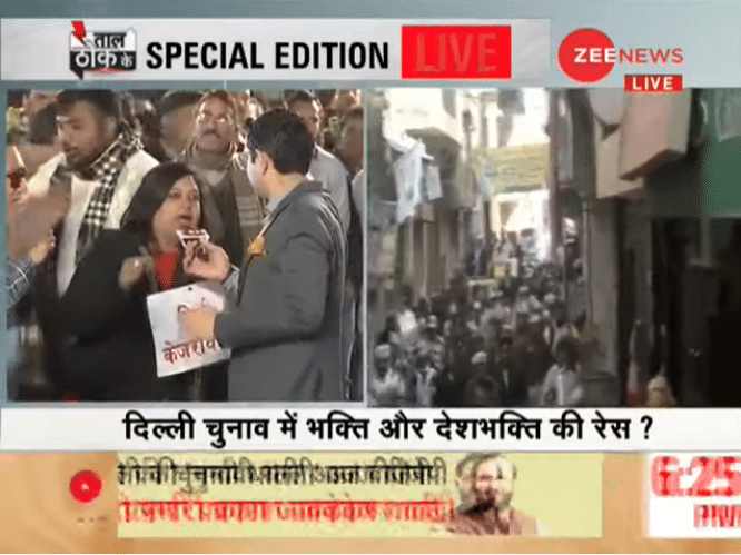 Zee News’ election debate with anchor Sachin Arora heard the crowd chant “Modi, Modi”, but anchor Arora pulled a woman with a pro-AAP poster aside, who excitedly asked which other chief minister had offered free water and electricity to people.