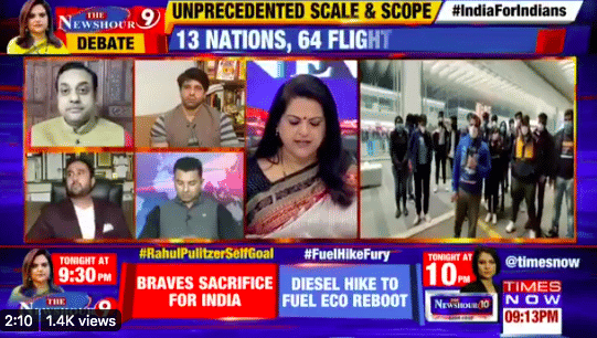 Times Now anchor Navika Kumar was back on her favourite target, Congress. Kumar said, “Congress now wades into the air fare debate. As usual, it has problems with air fares and has called them inhumane.” She referred to the cost of tickets for Indians who want to return home on special flights arranged by the government.