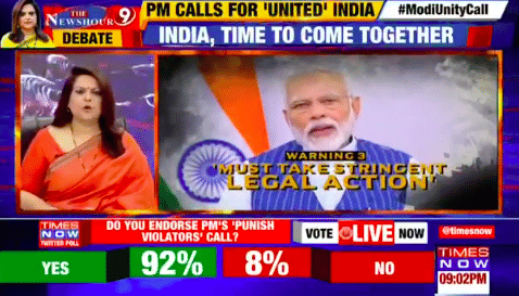 Times Now’s anchor Navika Kumar was in awe of PM Modi. Kumar announced, “Prime Minister Modi gave the most hard hitting message to each and every one of us. He has given a free run to the state governments to not spare any lockdown violators.”