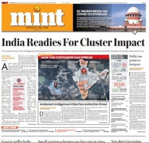 The lead in Hindustan Times is the same in all newspapers — the Tablighi Jamaat congregation. However HT also reports, ‘Now a disease hub, Jamaat defied series of anti-Covid curbs ‘. According to the paper, “Delhi Police on Tuesday registered a case against Maulana Saad, the head of the Tablighi Jamaat, and other officials of the group for defying a series of government orders that restricted gatherings in the city in a scaled manner between March 13 and March 21, before a full-fledged national lockdown was put in place on March 25 to contain the spread of the coronavirus disease (Covid-19).”