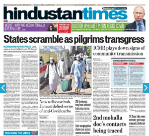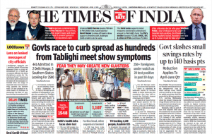 The Times Of India’s four-column lead story is ‘Govts race to curb spread as hundreds from Tablighi meet show symptoms’. It reports, “The aim is to stop those who attended the congregation, and the people they came into contact with, from inadvertently creating new clusters of infection across India… three southern states — Tamil Nadu, Andhra Pradesh and Karnataka — were trying to track at least 2,500 people, many of who had tested positive for Covid-19. Authorities believe several clerics from Malaysia, Indonesia and Thailand, who transited through the Tablighi Jamaat markaz (centre) in New Delhi’s Nizamuddin West, may have been the original source of the infections in the cluster.”