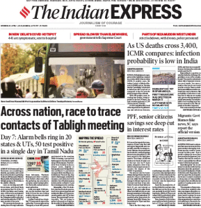 Calling it a race to trace contacts of Tabligh meeting, The Indian Express reports, “As many as 20 states and Union Territories are scrambling to identify, quarantine and test all those who attended a gathering of almost 4,000 people at Markaz Nizamuddin… in the middle of March.” It also provides details of the state-wise hunt.
