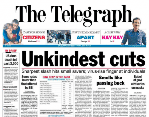 The Telegraph ignores the latest developments on the coronavirus front to concentrate on the latest news on the financial front. The lead headline is ‘Unkindest cuts’ on the slashing of savings rates.