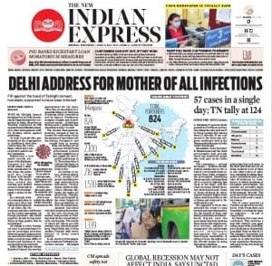 Alongside a comprehensive chart on the total number of foreigners, The New Indian Express’ lead calls Tablighi Jamaat headquarters “the biggest hotspot for coronavirus in India”. In ‘Delhi address for mother of all infections’, it notes that at least 10 people who were part of a religious gathering in the area contracted the virus and died.