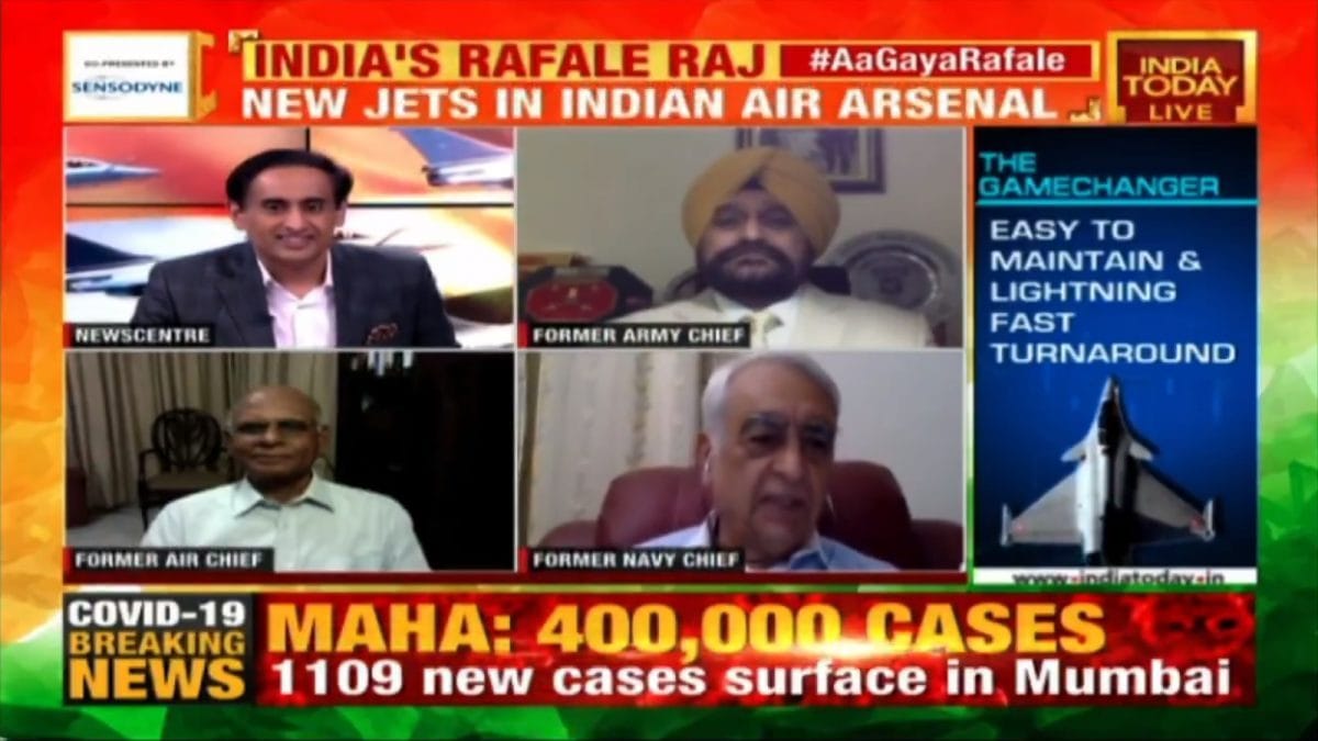 India Today‘s Rahul Kanwal discussed the arrival of the Rafale jets in the context of the Ladakh crisis. He first played devil’s advocate, saying, “There will be some cynics who’ll say there’s just five of them, the Chinese will probably be laughing — look at these Indians getting excited so excited about five aircrafts that are coming two decades too late”.