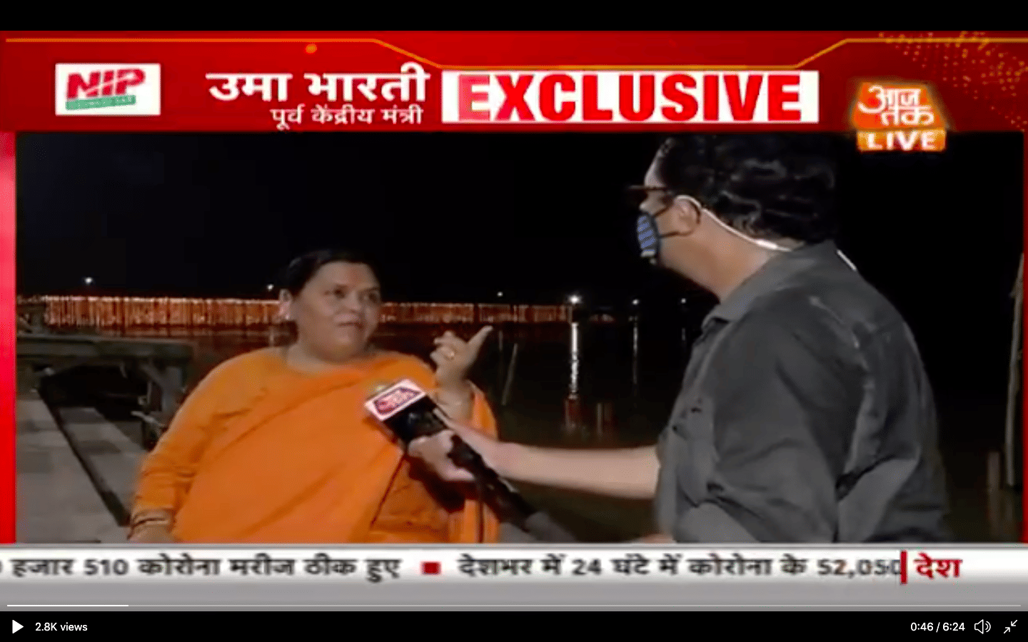 Aaj Tak had an “exclusive” conversation with Uma Bharti who was lighting diyas on the banks of the Saryu river in Ayodhya. Bharti, one of the most prominent faces of the Ram Janmabhoomi movement, had stated last week that she won’t be present at the bhoomi pujan as she didn’t want to potentially infect others with the coronavirus.