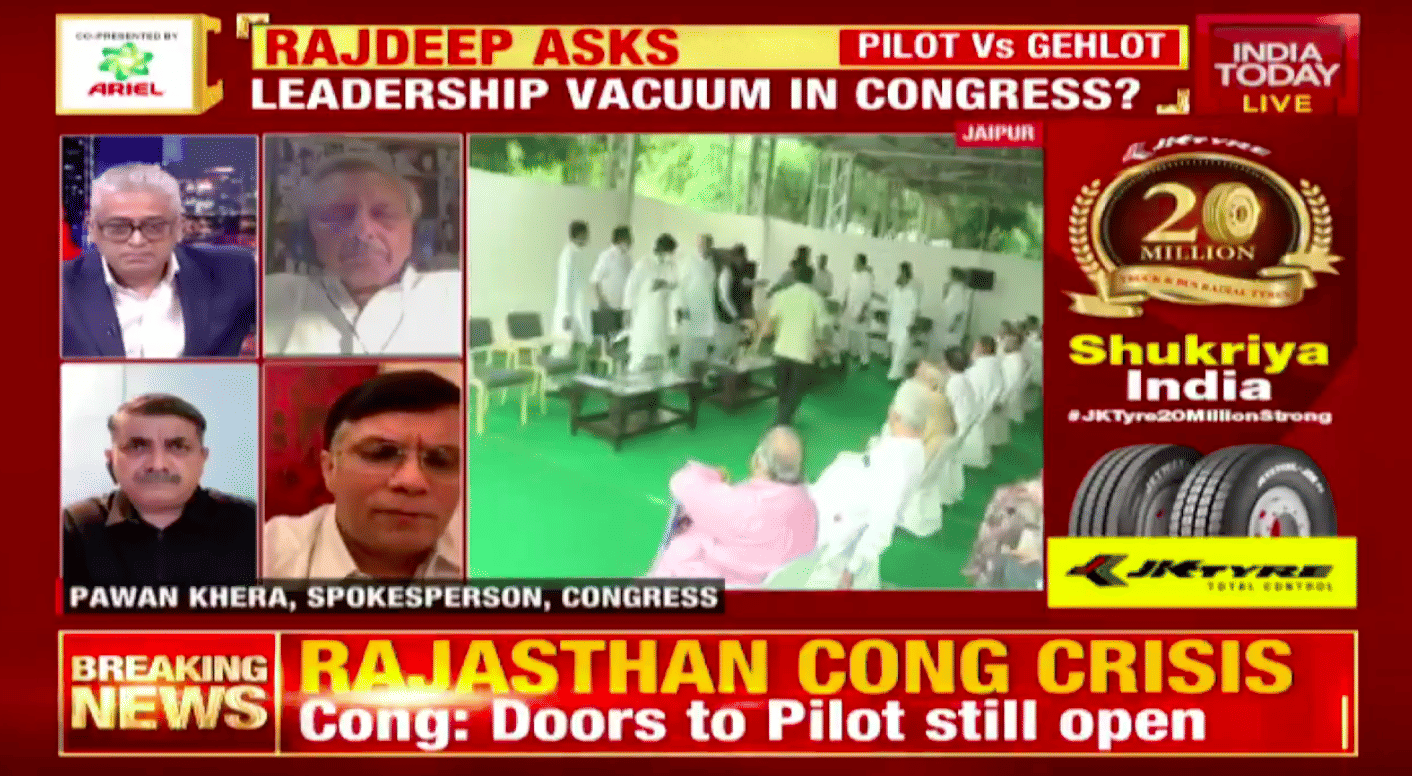India Today‘s Rajdeep Sardesai dived straight in and asked the Congress’ star spokesperson Pawan Khera, “Is the Rajasthan political crisis an ego battle between Ashok Gehlot and Sachin Pilot or is it the inability of your central leadership to enforce even a modicum of discipline?”