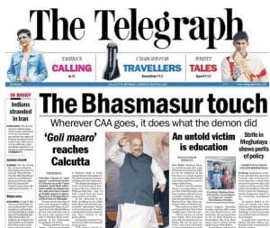 from Kolkata gives full front page coverage to Amit Shah, leading with the headline: “Wherever CAA goes, it does what the demon did”. The report notes “Amit Shah…. went into a strategy huddle aimed at capturing power in Bengal that stretched close to midnight.”