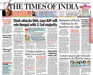 , in its lead (“Shah attacks Didi, says BJP will win Bengal with 2/3rd majority”), points out that Shah’s blistering attacks on Banerjee comes ahead of the 2021 assembly elections. He also said, “a son of the soil will be the CM, unlike the Trinamool’s “family succession” plan — an apparent reference to her nephew Abhishek.