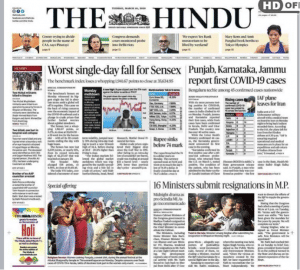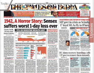 The Times of India calls it “1942, A Horror Story” as Sensex suffers worst loss in history, “tumbling down to 1,942 points” amid “the coronavirus impact and sliding oil prices. Dalal Street caved in under fears of financial instability in India due to the crisis at Yes Bank.”