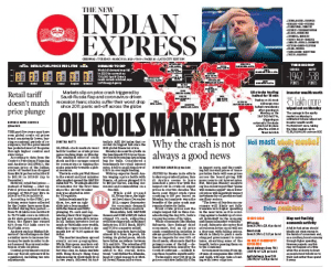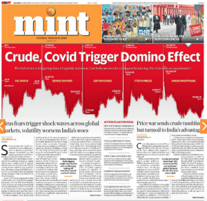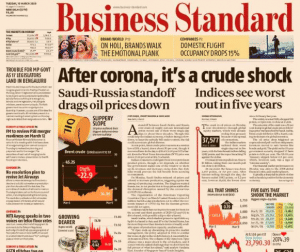 Although it may seem that Mint sees red in the crash in markets and crude oil prices, the paper indicates that while the slip in markets will worsen India’s woes, the price war could work to its advantage. Like Express, the paper notes in “Virus fears trigger shock waves…“ that “Indian shares saw their biggest single-day decline in absolute terms ever, wiping off investors’ wealth worth ₹7 trillion”. But while the crash in prices of crude oil has increased a risk of recessions, it “augurs well for the Indian economy”.