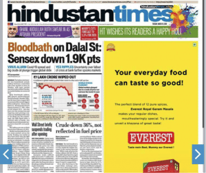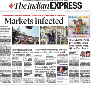 The Times of India calls it “1942, A Horror Story” as Sensex suffers worst loss in history, “tumbling down to 1,942 points” amid “the coronavirus impact and sliding oil prices. Dalal Street caved in under fears of financial instability in India due to the crisis at Yes Bank.”