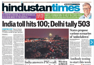 In a lead similar to TOI, Hindustan Times reports ‘India toll hits 100; Delhi tally 503’. According to the daily, “Sixteen fresh deaths and 514 new infections were reported on Sunday, the 12th day of a national lockdown that has been put in place to break the chain of infections. ‘Our focus is that we chase the virus, rather than the virus chasing us,’ health ministry joint secretary Lav Agarwal said during a news briefing.”