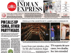 On Monday’s front pages, cheerful snapshots of Sunday’s ‘diya jalaao’ are a stark contrast to the grim headlines about the rising coronavirus death toll in India and the surge in cases.