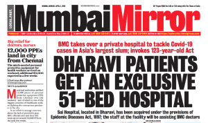 Mumbai Mirror has some reassuring news Monday — ‘DHARAVI PATIENTS GET AN EXCLUSIVE 51-BED HOSPITAL’. According to the paper, “To tackle the spread of coronavirus in Dharavi, the BMC on Sunday took over the entire 51-bed privately owned Sai Hospital in Dharavi to turn it into an isolation-cum-treatment centre. On Sunday evening, the total number of positive cases in Asia’s largest slum stood at five.”